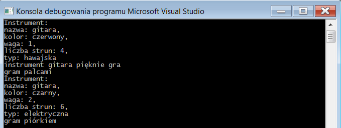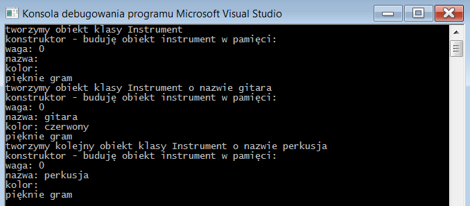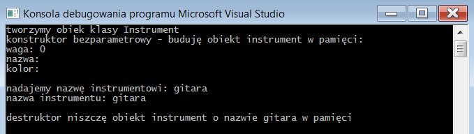 klasa Instrument z konstruktorem wieloparametrowym z argumentami domyślnymi oraz z listą inicjalizacyjną