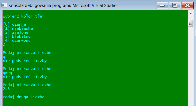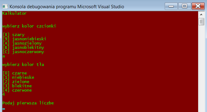 kalkulator 2.1, podział na funkcje, wybór koloru czcionek oraz koloru tła, zabezpieczenie przeciwko podaniu złych danych (np. zamiast liczby - litery)