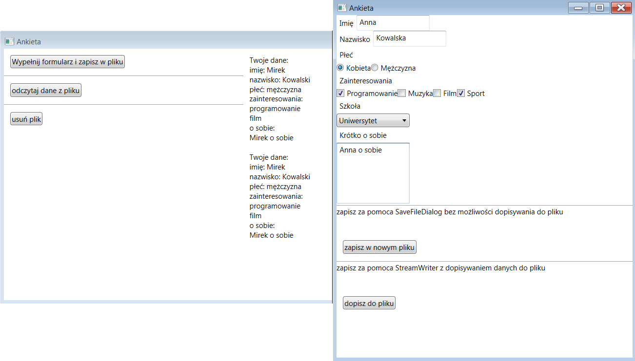 ankieta - użytkownik wypełnia ankietę, która jest zapisywana w pliku