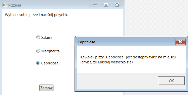 Pizzeria - zamówienie pizzy z potwierdzeniem wyboru, wykorzystanie przycisków radiowych, okienka MessageBox, źródło (tutorial .NET Core 3.1)
