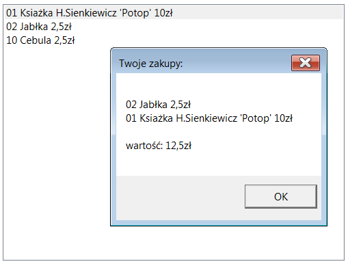Sklep - można wybierać towary z komponentu ListView, koszykiem jest MessageBox