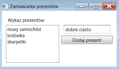 Zamawiarka Prezentów - można zamówić prezent u św. Mikołaja, wykorzystanie ListBox oraz DispatcherTimera (w celu wprowadzenia opóźnienia pokazania MessageBoxa),